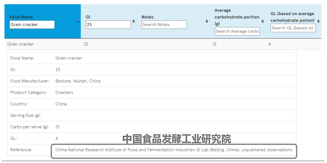 國際GI數據庫產品搜索結果頁(一款國內已測低GI的產品)