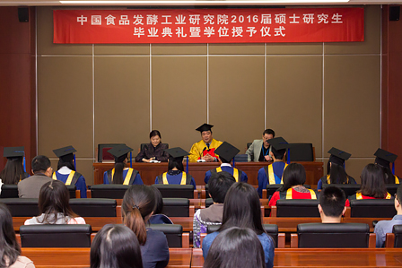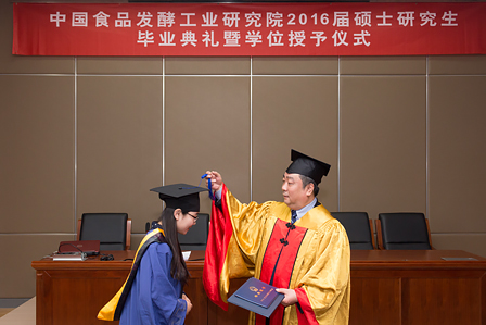 王潔副書(shū)記宣讀了中國(guó)食品發(fā)酵工業(yè)研究院學(xué)位評(píng)定委員會(huì)關(guān)于授予韓麗麗等八位同學(xué)工學(xué)碩士學(xué)位的決定,在莊嚴(yán)而熱烈的氣氛中,蔡木易院長(zhǎng)為碩士學(xué)位獲得者頒發(fā)畢業(yè)證書(shū)和學(xué)位證書(shū),并為學(xué)子們“撥穗”。