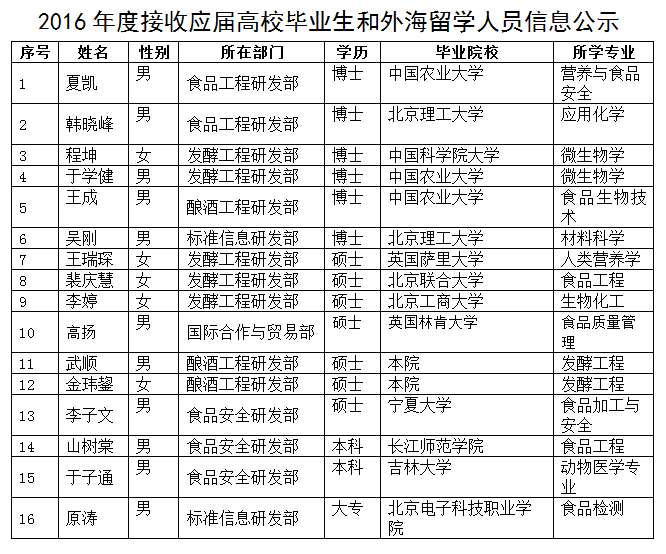 2016年度接收應屆高校畢業生和外海留學人員信息公示