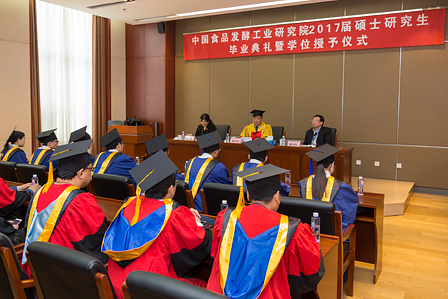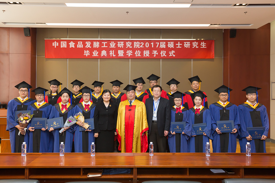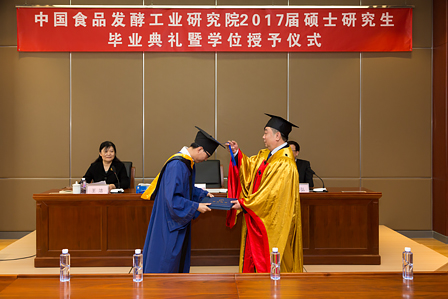 畢業典禮暨學位授予儀式在莊嚴的國歌聲中開始。隨后,王潔副書記宣讀了中國食品發酵工業研究院關于授予尹曼等8位同學工學碩士學位的決定。蔡木易院長在莊嚴而歡快的音樂聲中,為8位學位獲得者頒發畢業證書和學位證書,祝賀他們取得的成績,并為學子們“撥穗”,合影留念。
