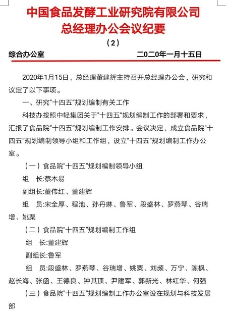 2月24日,召開了“十四五”規(guī)劃編制工作組會議,傳達了中輕集團對食品院十四五規(guī)劃編制工作的部署要求。在會上,全體編制組成員共同學(xué)習(xí)討論《中國食品科技:從2020到2035》等多個政策文件。