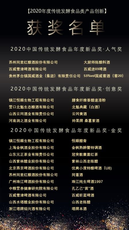 為進一步提升我國傳統發酵食品產業的科技創新能力,促進傳統發酵食品領域的技術交流與合作,展示我國廣大傳統發酵食品企業技術實力,共同助力我國傳統發酵食品產業轉型升級。 10月14日,由傳統發酵食品產業國際高峰論壇組委會舉辦的“2020年度傳統發酵食品類產品創新”評選完美收官,評選頒獎典禮在同期舉辦的“國際傳統發酵食品產業高峰論壇”開幕儀式上進行。