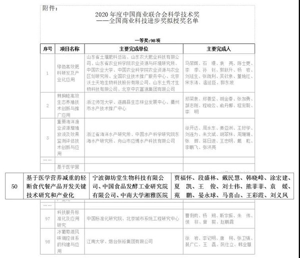 “2020年度中國商業(yè)聯(lián)合會科學技術獎”評審工作已經(jīng)完成。中國食品發(fā)酵工業(yè)研究院有限公司參與的《基于醫(yī)學營養(yǎng)減重的輕斷食代餐產(chǎn)品開發(fā)關鍵技術研究和產(chǎn)業(yè)化》項目榮獲一等獎。該項目由中國食品發(fā)酵工業(yè)研究院有限公司和寧波御坊堂生物科技有限公司歷時5年共同完成,并得到中南大學湘雅醫(yī)院的醫(yī)學支持和臨床驗證。