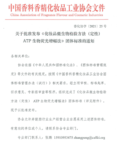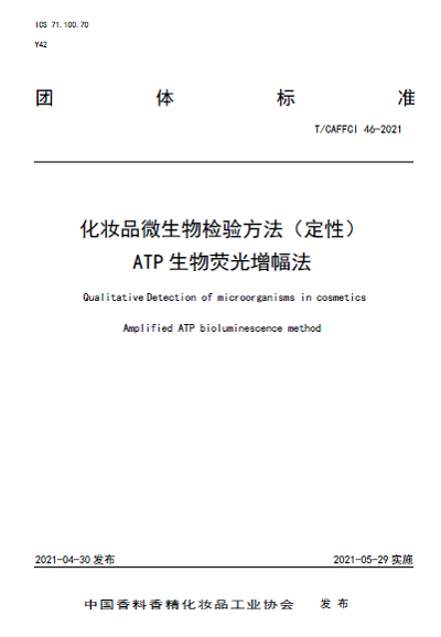 2021年4月30日,由中國食品發(fā)酵工業(yè)研究院牽頭,中國食品藥品檢定研究院、聯(lián)合利華(中國)有限公司、廣州寶潔有限公司、查士利華微生物應(yīng)用技術(shù)(上海)有限公司、廣州浪奇實業(yè)股份有限公司、上海創(chuàng)元化妝品有限公司參與起草的T/CAFFCI 46-2021《化妝品微生物檢驗方法(定性)ATP生物熒光增幅法》團(tuán)體標(biāo)準(zhǔn)經(jīng)中國香料香精化妝品工業(yè)協(xié)會批準(zhǔn)正式發(fā)布,計劃于2021年5月29日正式實施。