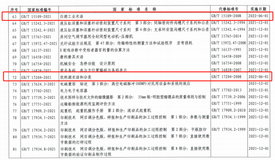 國家標準化管理委員會于2021年5月21日發(fā)布“2021年第7號中國國家標準公告”,GB/T 15109-2021《白酒工業(yè)術語》及GB/T 17204-2021《飲料酒術語和分類》兩項國家標準正式發(fā)布,實施日期為2022年6月1日。中國食品院承擔的白酒標委會秘書處及釀酒標委會秘書處隨后將針對新發(fā)布的兩項國家標準開展深入解讀工作。