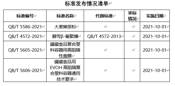其中由全國食品發酵標準化中心歸口制定的QB/T 5586-2021《大麥嫩苗粉》、 由全國食品工業標準化技術委員會工業發酵分技術委員會歸口修訂的QB/T4572-2021 《酵母β-葡聚糖》、由全國食品工業標準化技術委員會罐頭分技術委員會歸口制定的QB/T 5605-2021 《罐藏食品復合塑料容器用高阻隔性蓋膜》及 QB/T5606-2021 《罐藏食品用EVOH高阻隔復合塑料容器通用技術要求》正式發布,以上4項標準實施日期均為2021-10-01。