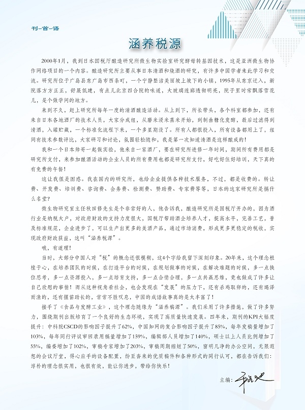 接手了《食品與發酵工業》,這個理念隨緣為“涵養稿源”。我們采用了許多措施,做了許多努力,圍繞期刊出版培育了一個良好的生態環境,實現了高質量快速發展。四年來,期刊的KPI大幅度提升:中科院CSCD的影響因子提升了62%,中國知網的復合影響因子提升了85%,每年發稿量增加了103%,每年同行評議審回錄用稿量增加了159%,編輯部人員增加了140%,碩士以上人員比例增加了55%,編委增加了102%,審稿專家增加了203%,審稿周期縮短了50%,窗明幾凈的辦公空間,無限遐想的會議廳堂,得心應手的設備配置,紛至沓來的優質稿件和各種形式的同行認可,都在告訴我們:淳樸的理念很實用,也很有效,能讓你進步,帶給你快樂!
