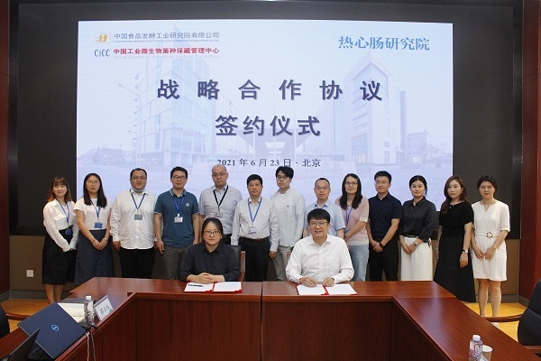 2021年6月23日,中國食品發酵工業研究院有限公司中國工業微生物菌種管理保藏中心(CICC)與熱心腸研究院在京舉行戰略合作協議簽約儀式,雙方在益生菌資源發掘、行業技術規范、技術標準發布和科學普及等方面開展戰略合作。食品院副院長、CICC主任程池教授,食品院院長助理、CICC常務副主任姚粟教授,熱心腸研究院院長藍燦輝,中科院青島生物能源與過程所朱鵬飛研究員等14人出席簽約儀式。
