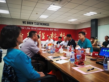 2021年7月5日,中國食品發酵工業研究院總經理董建輝帶領釀酒工程研發部、食品工程研發部與標準信息研發部相關人員赴百威亞洲最大的單體啤酒工廠——莆田工廠,與百威英博亞太區供應鏈與物流副總裁程衍俊一行,就深化雙方合作舉行會談。雙方會談旨在通過合作,更好的推動百威與中國啤酒行業的發展。