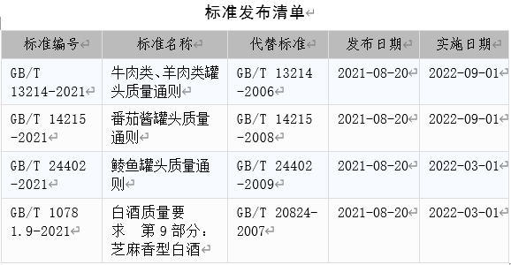 其中,由中國食品發酵工業研究院有限公司所屬全國食品工業標準化技術委員會歸口修訂的GB/T 13214-2021《牛肉類、羊肉類罐頭質量通則》、GB/T 14215-2021《番茄醬罐頭質量通則》及GB/T 24402-2021《鯪魚罐頭質量通則》;由全國白酒標準化技術委員會歸口修訂的GB/T 10781.9-2021《白酒質量要求 第9部分:芝麻香型白酒》四項推薦性國家標準正式發布。