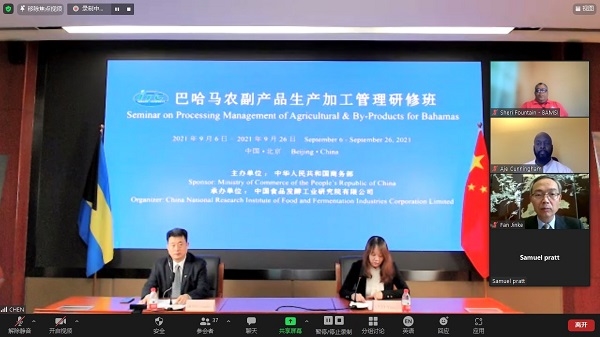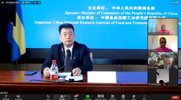 2021年9月6日,由國家商務(wù)部主辦、中國食品發(fā)酵工業(yè)研究院承辦的“巴哈馬農(nóng)副產(chǎn)品生產(chǎn)加工管理研修班”成功舉辦了線上開班儀式。中國駐巴哈馬特命全權(quán)大使戴慶利、巴哈馬農(nóng)業(yè)與海洋資源部常務(wù)秘書(副部級)喬爾·劉易斯、食品院總經(jīng)理董建輝、中國駐巴哈馬經(jīng)濟(jì)商務(wù)參贊樊金科出席了開班儀式,食品院總經(jīng)理助理羅燕琴主持開班儀式。