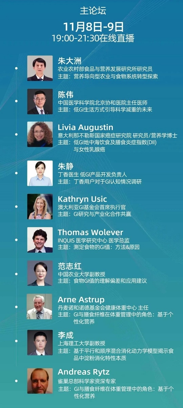 大會將由來自農業農村部、北京協和醫院、中國農業大學、上海理工大學,澳大利亞GI基金會、加拿大INQUIS醫學研究中心、丹麥諾和諾德基金會健康體重中心、意大利那不勒斯國家癌癥中心等GI領域國內外行業大家和資深教授學者分享前沿新知,以及來自丁香醫生、雀巢等GI行業的企業代表分享多領域行業進展及研究新知。
