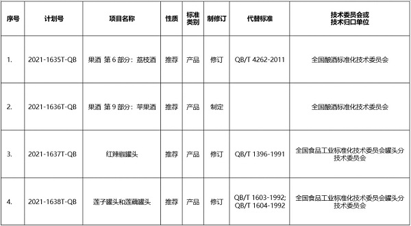 為進(jìn)一步做好上述4項(xiàng)輕工行業(yè)標(biāo)準(zhǔn)的制修訂工作,全國釀酒標(biāo)準(zhǔn)化技術(shù)委員會(huì)秘書處、全國食品工業(yè)標(biāo)準(zhǔn)化技術(shù)委員會(huì)罐頭秘書處將按照相關(guān)規(guī)定,公開征集起草單位,并在標(biāo)準(zhǔn)起草過程中加強(qiáng)與相關(guān)單位的協(xié)調(diào),廣泛征求意見,確保標(biāo)準(zhǔn)質(zhì)量,按要求完成標(biāo)準(zhǔn)制修訂任務(wù)。
