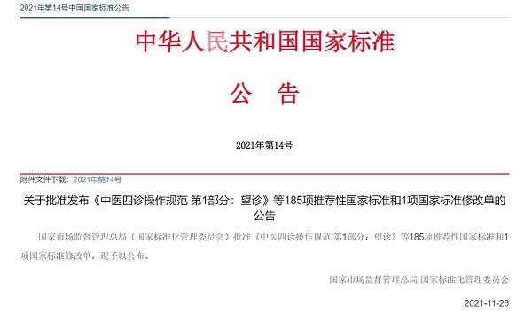 根據中華人民共和國國家標準公告(2021年第14號),國家市場監督管理總局(國家標準化管理委員會)批準《中醫四診操作規范 第1部分:望診》等185項推薦性國家標準和1項國家標準修改單。