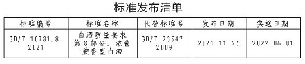 其中,由中國食品發酵工業研究院有限公司所屬全國白酒標準化技術委員會歸口修訂的GB/T 10781.8-2021《白酒質量要求 第8部分:濃醬兼香型白酒》一項推薦性國家標準正式發布。