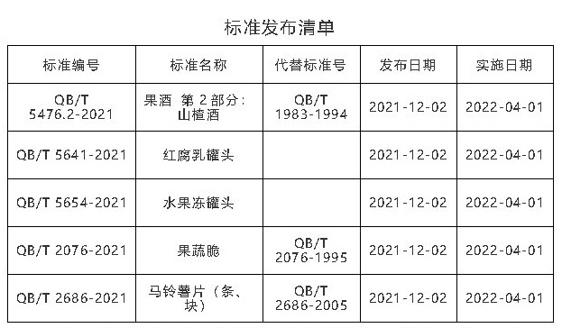 根據(jù)中華人民共和國(guó)工業(yè)和信息化部公告(2021年第33號(hào)),中國(guó)食品發(fā)酵工業(yè)研究院有限公司承擔(dān)秘書(shū)處的全國(guó)釀酒標(biāo)準(zhǔn)化技術(shù)委員會(huì)歸口修訂的QB/T 5476.2-2021《果酒 第2部分:山楂酒》;全國(guó)食品工業(yè)標(biāo)準(zhǔn)化技術(shù)委員會(huì)罐頭分技術(shù)委員會(huì)歸口制定的QB/T 5641-2021《紅腐乳罐頭》、QB/T 5654-2021《水果凍罐頭》;全國(guó)食品發(fā)酵標(biāo)準(zhǔn)化中心歸口修訂的QB/T 2076-2021《果蔬脆》、QB/T 2686-2021《馬鈴薯片(條、塊)》共計(jì)五項(xiàng)行業(yè)標(biāo)準(zhǔn)正式發(fā)布。實(shí)施日期為2022年4月1日。