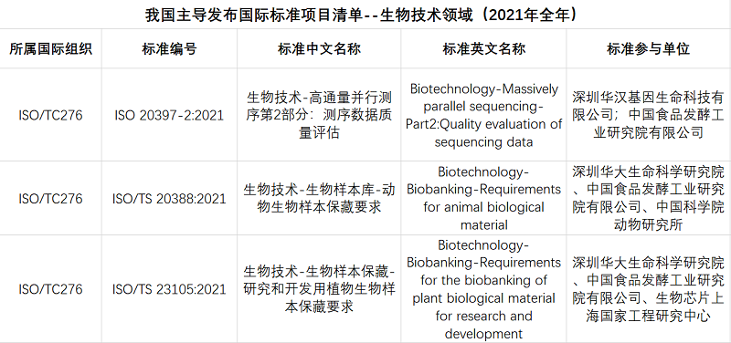 2022年3月8日,國家市場監督管理總局標準創新管理司公開了2021年國際標準化組織(ISO)發布的由我國牽頭制修訂的國際標準情況,生物技術領域2021年主導發布了3項國際標準。中國食品發酵工業研究院有限公司作為國際標準化組織生物技術委員會(ISO/TC276)國內技術對口單位,與深圳華大生命科學研究院、深圳華漢基因生命科技有限公司等單位,歷經近5年時間和幾十次國內外討論會,聯合主導完成了該3項國際標準的制定工作。