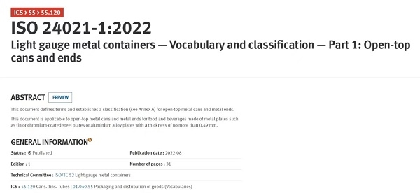 2022年8月26日,由中國食品發酵工業研究院有限公司聯合國內相關企事業單位研制的ISO 24021-1:2022 Light gauge metal containers — Vocabulary and classification — Part 1: Open-top cans and ends《薄壁金屬容器-詞匯和分類-第1部分:開頂罐和蓋》國際標準正式發布,該標準是我國主導完成的第二項薄壁金屬容器領域國際標準。