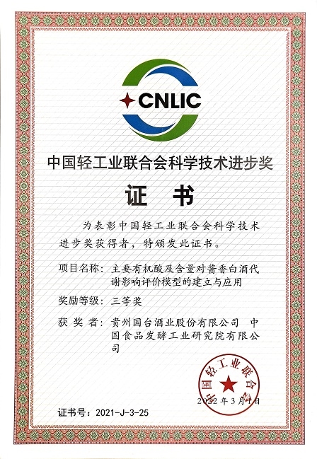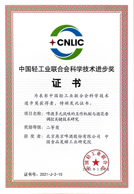 近日,中國(guó)食品發(fā)酵工業(yè)研究院有限公司聯(lián)合北京燕京啤酒股份有限公司的科技成果《啤酒多元風(fēng)味的互作機(jī)制與酒花香調(diào)控關(guān)鍵技術(shù)》,聯(lián)合貴州國(guó)臺(tái)酒業(yè)股份有限公司的科技成果《主要有機(jī)酸及含量對(duì)醬香白酒代謝影響評(píng)價(jià)模型的建立與應(yīng)用》,分別榮獲2021年度中國(guó)輕工業(yè)聯(lián)合會(huì)科技進(jìn)步二等獎(jiǎng)和三等獎(jiǎng)。