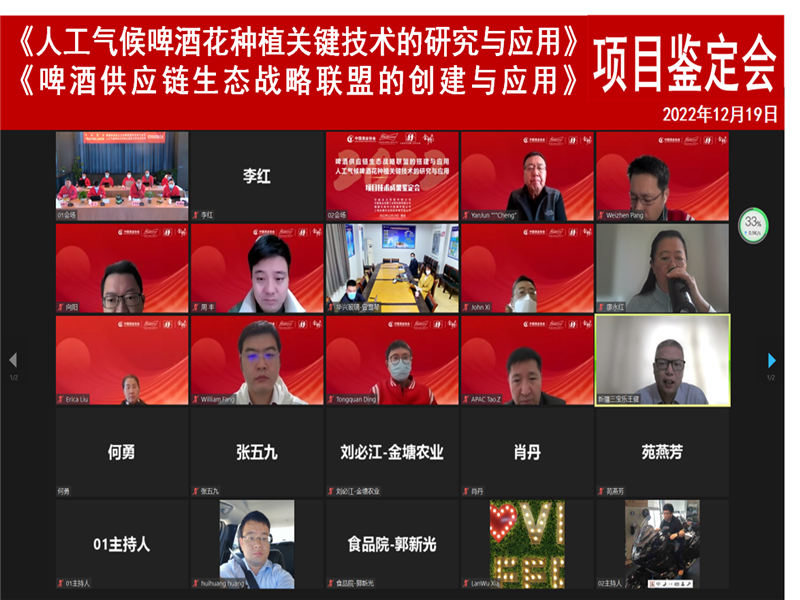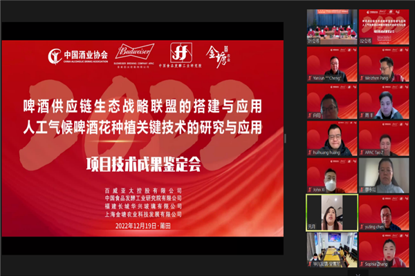 2022年12月19日,由百威亞太控股有限公司和中國食品發(fā)酵工業(yè)研究院有限公司合作完成的“啤酒供應(yīng)鏈生態(tài)戰(zhàn)略聯(lián)盟的創(chuàng)建與應(yīng)用”和“人工氣候啤酒花種植關(guān)鍵技術(shù)的研究與應(yīng)用”兩個項目通過了由中國酒業(yè)協(xié)會組織的科技成果鑒定,鑒定委員會一致認(rèn)為這兩個項目成果均為國內(nèi)首創(chuàng),技術(shù)水平達到國際領(lǐng)先水平。