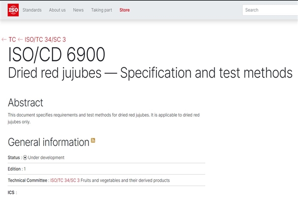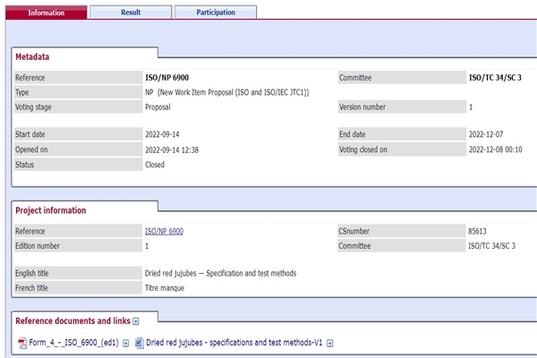 2023年1月11日,由中國食品發酵工業研究院有限公司與國內企事業單位聯合提出的《Dried red jujubes – Specification and test methods 干制紅棗-規格和測試方法》(ISO/CD 6900)國際標準成功立項。