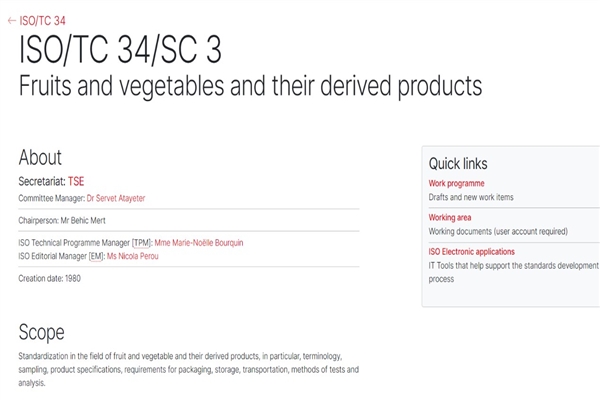 國際標準化組織食品委員會果蔬及其制品分委會工作范圍為水果和蔬菜及其制品領域的標準化工作,主要涉及術語、取樣、產品規格、包裝要求、儲存要求、運輸要求以及檢測和分析方法方面。目前,該分委會有18個積極成員國和59個觀察員國,中國食品院承擔該分委會的國內技術對口單位工作。