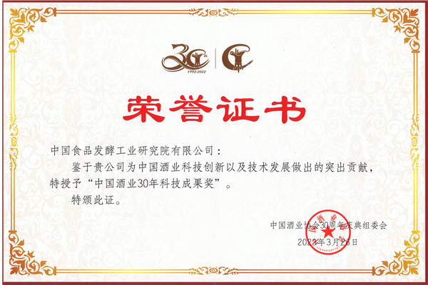 2023年3月26日,在中國酒業協會成立三十周年慶典上,中國酒業協會對30年來為中國酒業發展做出重大貢獻的功勛人物和企業進行了表彰。中國食品發酵工業研究院有限公司榮獲“中國酒業30年科技成果獎”榮譽獎勵。