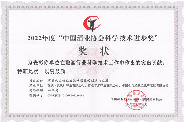 聯合百威(武漢)和百威(雪津)啤酒有限公司《啤酒供應鏈生態戰略聯盟的創建與應用》項目成果榮獲科學技術進步一等獎