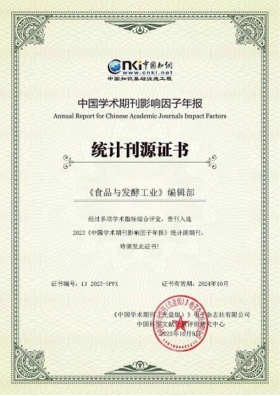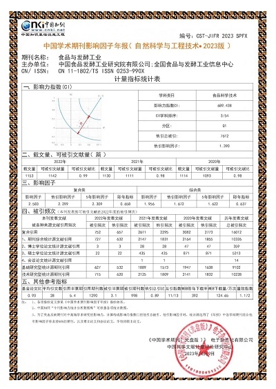 《食品與發酵工業》由中國食品發酵工業研究院主辦,創刊于1970年。多次榮獲“中國百種杰出學術期刊獎”“中國精品科技期刊”等稱號;連續兩年被評為《科技期刊世界影響力指數WJCI》食品科學技術類Q1區學術期刊,并成功入選《食品科學與工程領域高質量科技期刊分級目錄》T1類,是中國科學引文數據庫(CSCD)核心期刊、中文核心期刊、中國科技核心期刊。