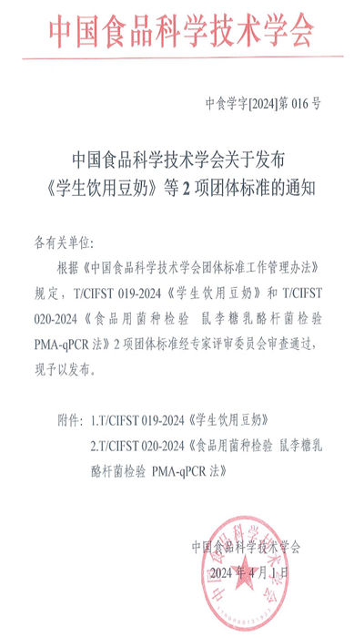 2024年4月,中國食品院牽頭起草的T/CIFST 020-2024《食品用菌種檢驗 鼠李糖乳酪桿菌檢驗 PMA-qPCR法》團體標準正式發布,并于2024年4月1日正式實施。本標準由中國食品科學技術學會組織起草,起草單位包括中國食品發酵工業研究院、國家食品安全風險評估中心、湯臣倍健股份有限公司、山西大學、丹尼斯克(中國)有限公司、內蒙古伊利實業集團股份有限公司、內蒙古蒙牛乳業(集團)股份有限公司、光明乳業股份有限公司、微康益生菌(蘇州)股份有限公司、北京科拓恒通生物技術股份有限公司。