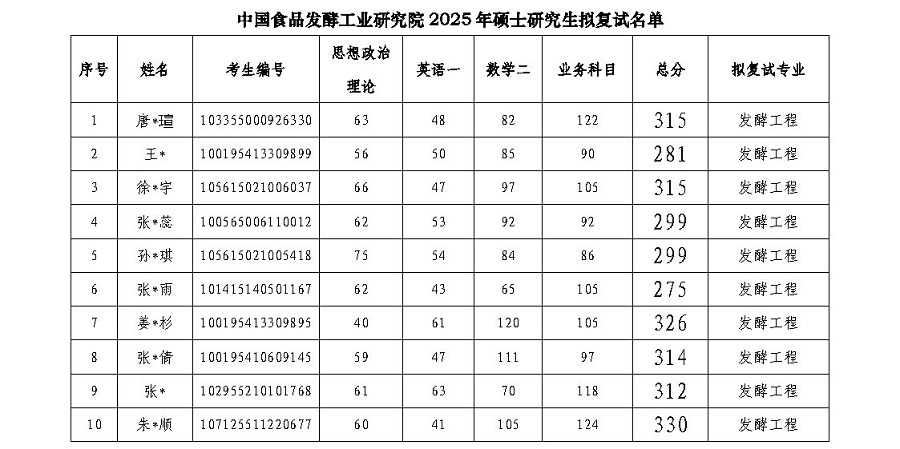 中國食品發酵工業研究院2025年碩士研究生擬復試名單