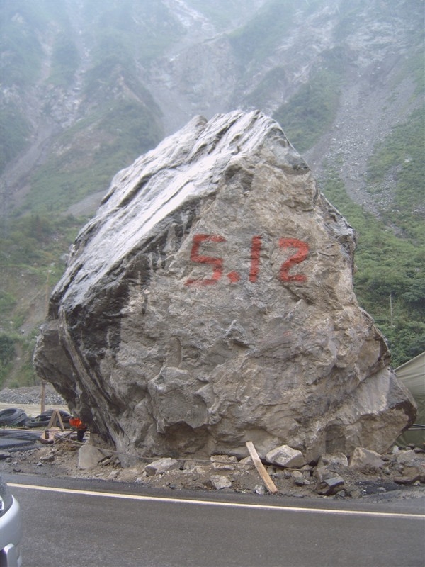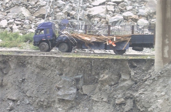 彭云:有天中午,我們從夾壁鄉衛生院巡查完趕去另一個工地,兩個工地之間有一段未完工的317國道路基。受地震影響,道路遭受嚴重的破壞,兩邊山上時有滾石掉下。車在顛簸、搖晃中緩慢行駛,過了畢棚溝路口的小橋后是一個急轉彎。突然,前面從山上滾下一根木頭橫在車前,司機劉定峰大喊一聲“壞了!”,瞬間車子跳起來,劇烈搖晃,我下意識抱住了頭,身體在車內左右撞擊,周圍的東西在搖晃,車在旋轉,十幾秒鐘以后,一切戛然停止。我們又怔了十幾秒,“大家沒事吧?”我們異口同聲問道,我試著動了動四肢,沒受傷,其他人也都沒有受傷。在附近目睹這驚險場面的工友們全部跑過來拉我們出去。從車子里出來后,我們發現側翻車輛離河邊只有兩米!也要感謝劉定峰,在車摔到坑里前他死死的抓住方向盤,踩著剎車,避免了更大的險情發生。
