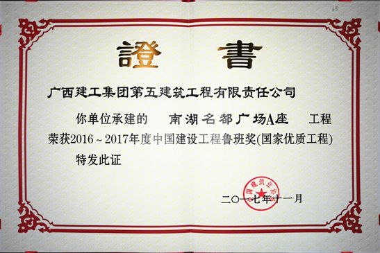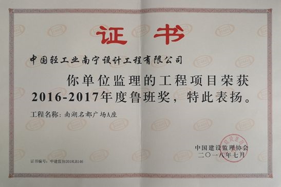 近日,海誠股份南寧公司監理的工程項目—南湖名都廣場榮獲中國建設監理協會授予“2016-2017年度魯班獎”。魯班獎是中國建筑行業工程質量最高榮譽獎,這是公司繼廣西壯族自治區人民檢察院業務技術偵查綜合樓(2005年獲魯班獎)、廣西南寧市國土交易綜合樓(2011年獲魯班獎)后,再次獲此殊榮,具有里程碑的意義。