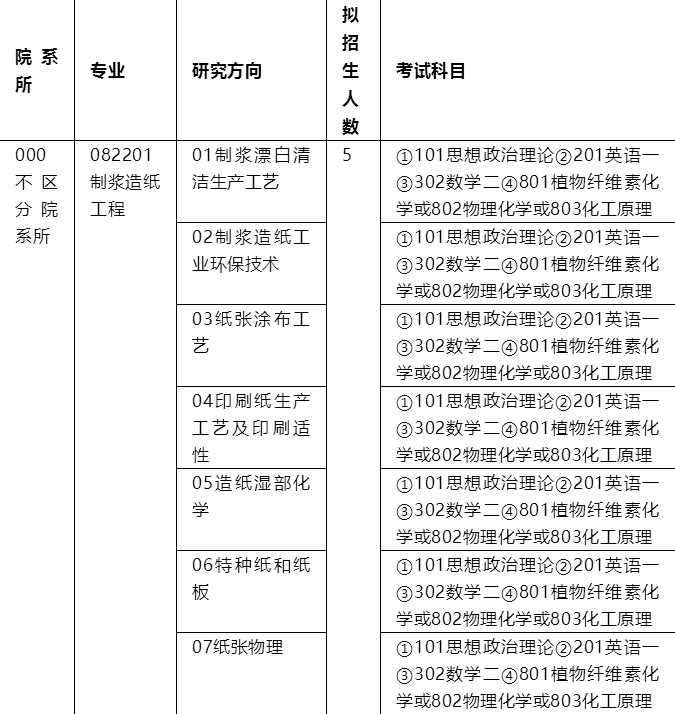 (三)全國統考初試科目為思想政治理論、英語(一)、數學(二)、植物纖維素化學或物理化學或化工原理,其中思想政治理論、英語(一)、數學(二)由教育部統一命題,植物纖維素化學、物理化學、化工原理由我院組織命題。
