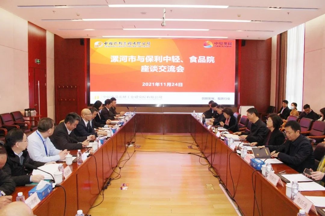 2021年11月24日上午,中國保利集團有限公司(以下簡稱“保利集團”)黨委常委、副總經理,中國輕工集團有限公司(以下簡稱“保利中輕”)黨委書記、董事長張萬順,保利中輕紀委書記童云翔、副總經理蔡木易在中國食品發酵工業研究院有限公司(以下簡稱“中國食品研究院”)會見河南省漯河市市委書記劉尚進、市政協主席呂巖、市委常委、宣傳部部長、市政府副市長常英敏一行,雙方就推動未來合作進行交流探討。