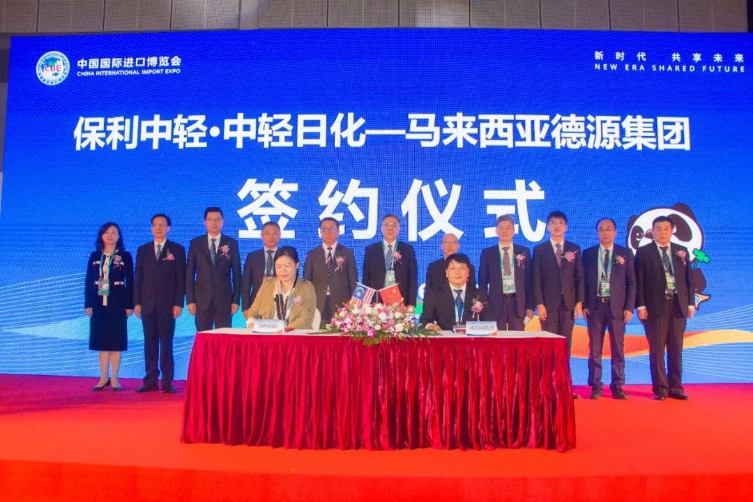 11月7日下午,在第四屆中國國際進口博覽會上,保利中輕所屬中輕日化科技有限公司(以下簡稱中輕日化)與馬來西亞德源集團(以下簡稱德源集團)簽署采購協議。保利集團黨委常委、副總經理張曦,保利中輕總經濟師趙國昂,保利集團戰投中心副主任杜鵬,中輕日化董事長耿濤、總經理封益民出席簽約儀式。