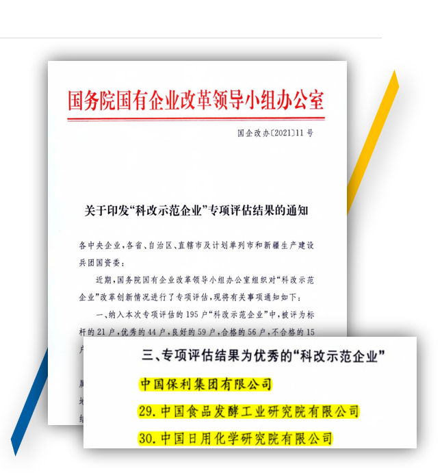 早在2020年4月,中國食品發酵工業研究院和中國日用化學工業研究院便入選 “科改示范企業”名單。兩家企業圍繞科技創新和市場化改革兩個維度,不斷增強“科改示范企業”的發展動力、潛力、活力,全面釋放改革紅利,在2021年“科改示范企業”改革創新專項評估中均被國務院國資委評為優秀。