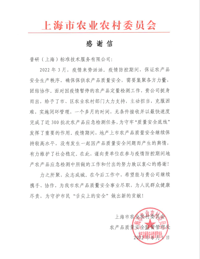 “面對因疫情暫停的農產品定量檢測工作,貴公司挺身而出,給予了市、區農業農村部門大力支持......” 6月1日,保利中輕所屬中輕檢驗認證有限公司(以下簡稱“中輕檢驗”)普研(上海)標準技術服務有限公司(以下簡稱“普研標準”)收到一封來自上海市農業農村委員會發來的感謝信。信中對中輕檢驗普研標準參與上海疫情防控期間農產品應急檢測所做的工作和付出的努力致以衷心的感謝。
