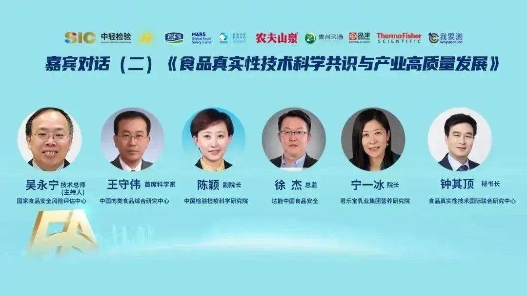 國家食品安全風險評估中心技術總師吳永寧、中國肉類食品綜合研究中心首席科學家王守偉、中國檢驗檢疫科學研究院副院長陳穎、達能中國食品安全總監徐杰、君樂寶乳業集團營養研究院院長寧一冰、食品真實性技術國際聯合研究中心秘書長鐘其頂就“食品真實性技術科學共識與產業高質量發展”展開對話,從各自研究領域探討食品真實性現狀、真實性發展趨勢和企業如何保障產品品質安全、真實。