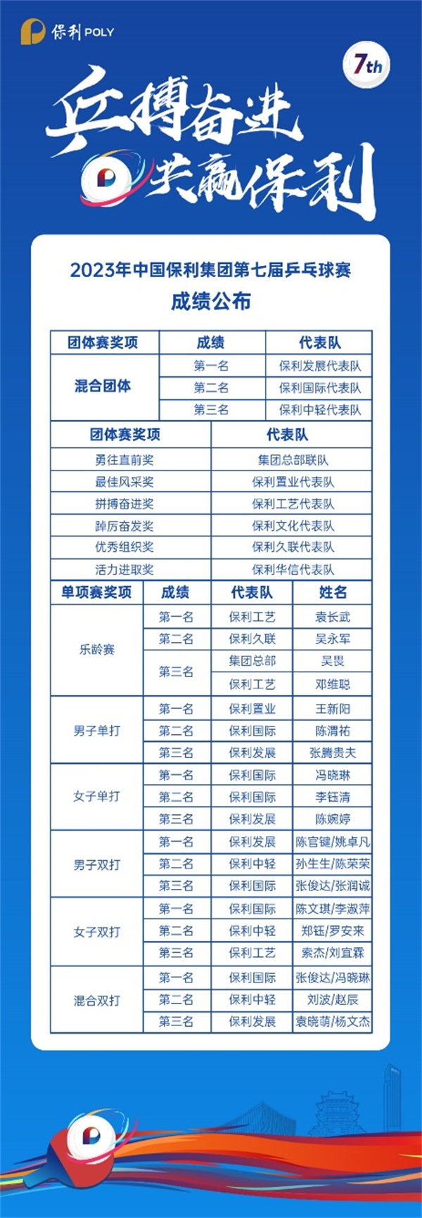單項賽中,保利中輕代表隊持續發揚勇于爭先、團結協作優良傳統,斬獲男子雙打、女子雙打和混合雙打三項亞軍,創造了歷史最好成績。