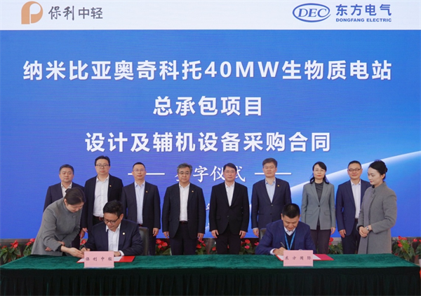 保利中輕副總經理、中國海誠董事長趙國昂與東方國際副總經理周杰代表雙方簽署戰略合作協議。中國海誠副總裁羅軍與東方國際機電事業部總經理杜曉東代表雙方簽署納米比亞奧奇科托40MW生物質電站總承包項目設計及輔機設備采購合同。簽約儀式前,雙方就深化合作深入友好交流。