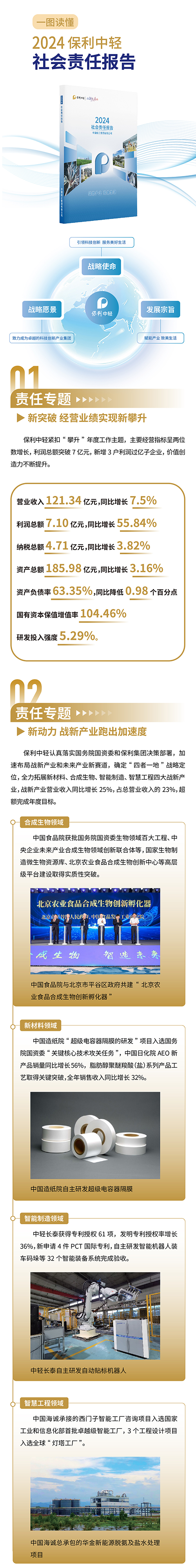 7月15日,保利中輕正式發布2024年度社會責任報告(簡稱“《報告》”)。《報告》全面呈現保利中輕聚焦服務國家戰略,深入實施國有企業改革深化提升行動、推進傳統產業轉型升級、積極布局戰略性新興產業、培育發展新質生產力、守護綠水青山等方面成果成效,以實際行動詮釋“美好生活領創者”責任擔當。