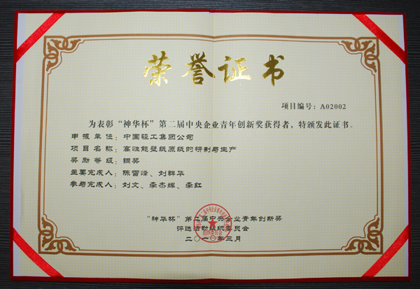 3月30日,“神華杯”第二屆中央企業青年創新獎表彰大會在京舉行,國資委主任李榮融發表重要講話。中國輕工集團公司“高性能壁紙原紙的研制與生產”項目榮獲“神華杯”第二屆中央企業青年創新獎銅獎,該項目由中國制漿造紙研究院研究開發部特種紙技術研發中心完成。