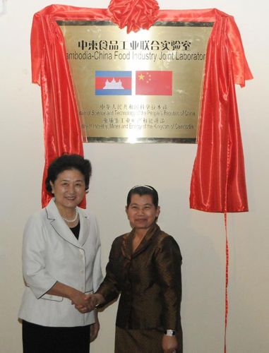 2012年12月7日,國務(wù)委員劉延?xùn)|與柬埔寨王國副首相梅森安在柬埔寨首都金邊共同為“中柬食品工業(yè)聯(lián)合實驗室”揭牌。教育部部長袁貴仁、科技部黨組書記王志剛、國務(wù)院副秘書長江小涓、外交部副部長宋濤及柬埔寨國務(wù)委員會、工業(yè)礦產(chǎn)及能源部、教育部、外交部等部門高級官員出席揭牌儀式。集團公司陳鄂生董事長出席儀式并陪同兩國領(lǐng)導(dǎo)人參觀了實驗室。集團公司所屬中國食品發(fā)酵工業(yè)研究院院長蔡木易、中國海誠股份南寧公司董事長王毅軍等中柬雙方項目執(zhí)行人員參加了典禮。