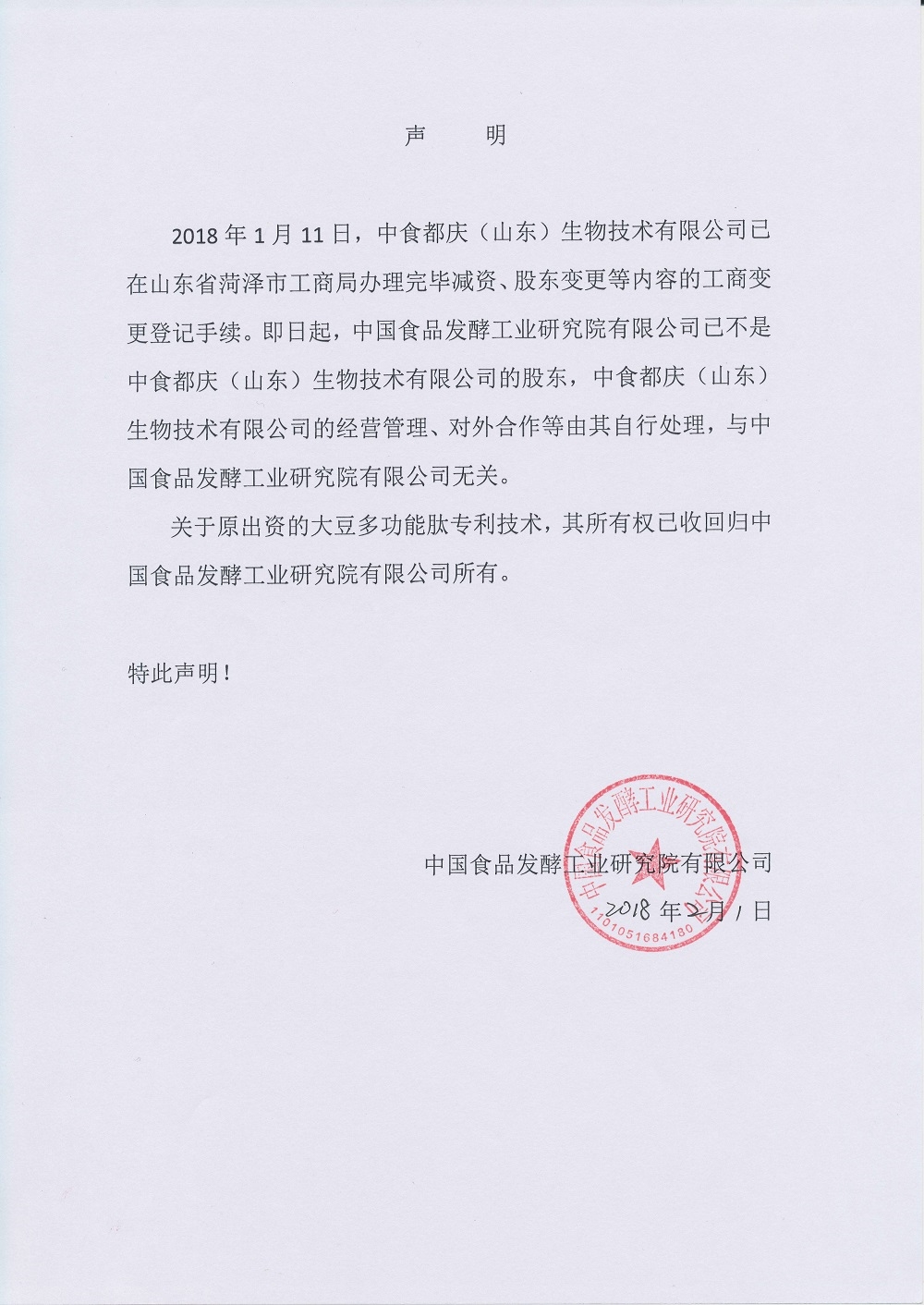 我院與中食都慶(山東)生物技術有限公司解除股東關系及專利技術收回聲明