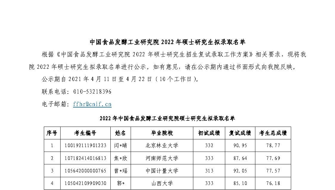 中國食品發酵工業研究院2022年碩士研究生擬錄取名單