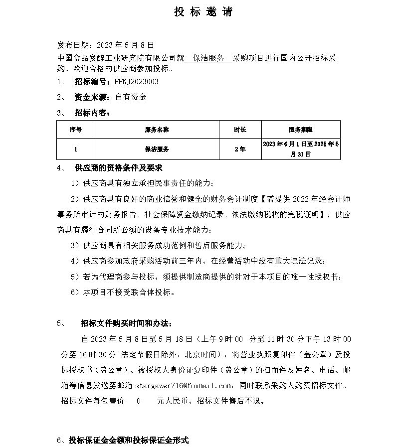 投標邀請--保潔服務(FFKJ2023003)