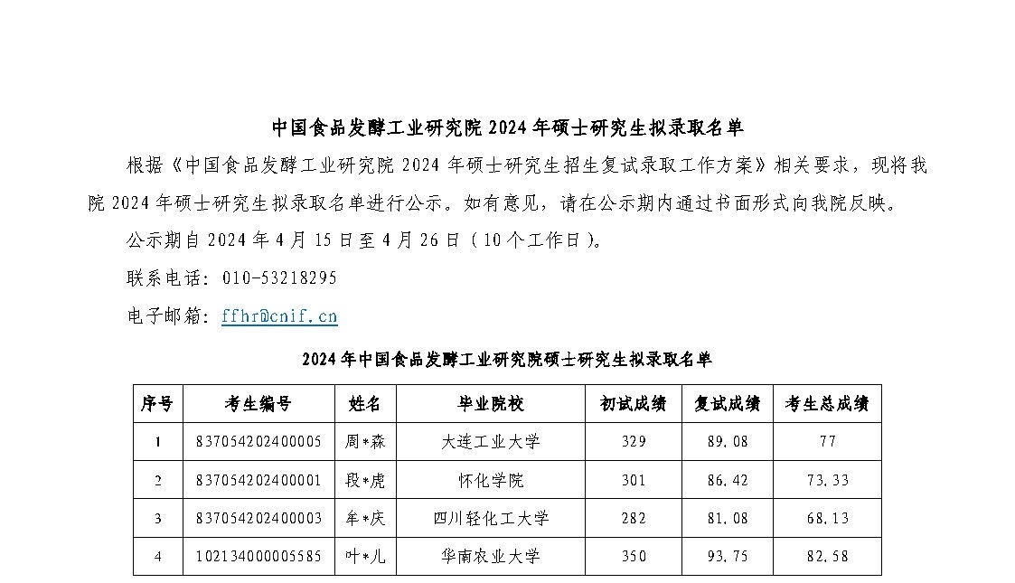 中國食品發酵工業研究院2024年碩士研究生擬錄取名單