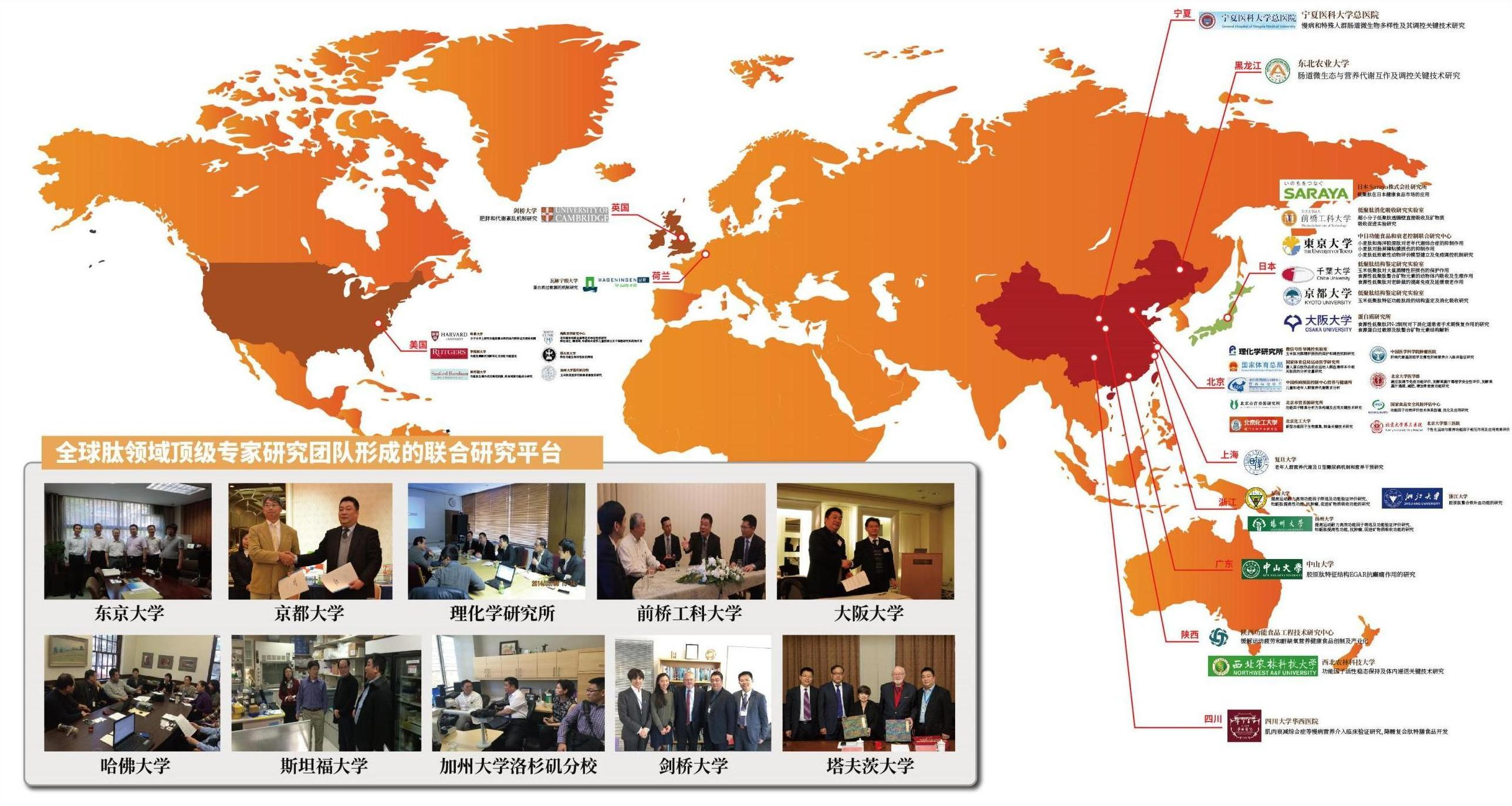 長期以來,北京市蛋白功能肽工程技術研究中心和日本東京大學、京都大學、理化研究所、大阪大學、千葉大學,美國哈佛大學、加州大學、桑福德-伯納姆醫學研究所、梅奧醫學中心等國外著名學府及研究機構建立了良好的技術交流和合作關系,共同建立食源肽國際合作研究平臺。合作雙方就蛋白功能肽的分離純化、結構鑒定、功能性評價、作用機制等方面展開合作,特別是對食源肽解酒保肝作用機理、食源肽在防治老年癡呆癥及機體衰老中的應用等課題進行深入合作研究。