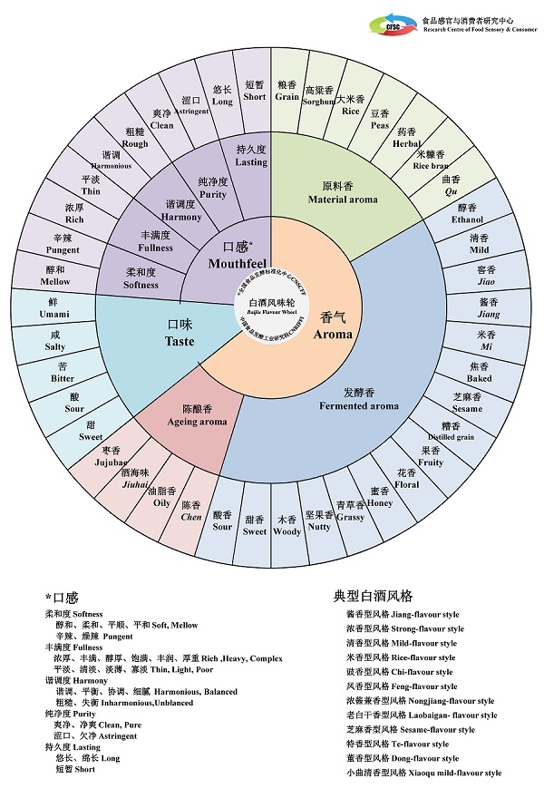 1、《白酒感官品評(píng)術(shù)語(yǔ)》(GB/T 33405-2016):在感官認(rèn)知規(guī)范及表達(dá)語(yǔ)言研究方面,通過對(duì)國(guó)際酒類風(fēng)味輪術(shù)語(yǔ)制定過程論證,搜集整理了一千余條專業(yè)品酒師評(píng)酒用語(yǔ);研究分析了消費(fèi)者對(duì)白酒的描述用語(yǔ)和認(rèn)知習(xí)慣,篩選獲得“醬香、糧香、焦香、酸香、甜香、果香、花香、米香、油脂味、生青味”等特征描述術(shù)語(yǔ)。整理了原料香、發(fā)酵香、陳釀香三大類27個(gè)典型香氣特征,柔和度、豐滿度、諧調(diào)度、純凈度、持久度等五大口感維度及多種口味特征,研究形成“中國(guó)白酒風(fēng)味輪”術(shù)語(yǔ)的基本框架及主要內(nèi)容,以促進(jìn)傳統(tǒng)白酒感官品評(píng)用語(yǔ)的規(guī)范化及標(biāo)準(zhǔn)化。